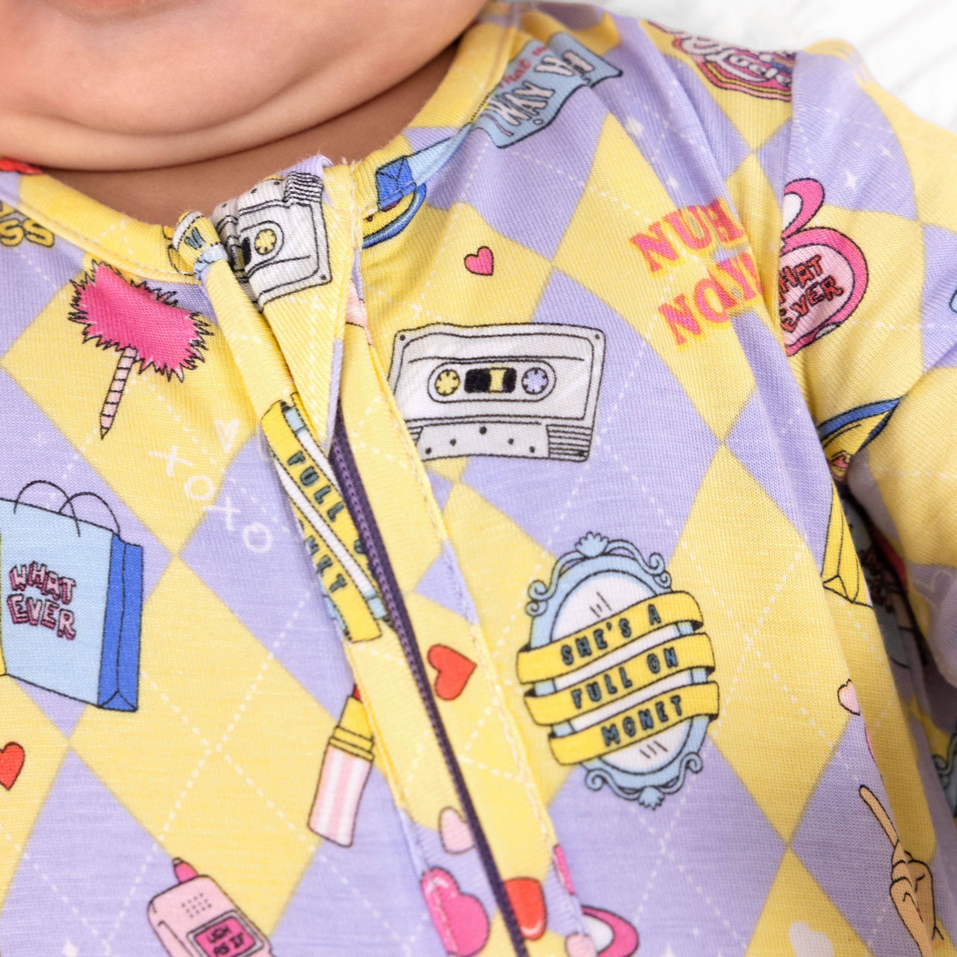 Inspired by Cher’s iconic confidence and playful style, the “As If!” Bamboo Convertible Footie brings together fashion forward charm and everyday comfort. Made from buttery soft, breathable bamboo fabric, this footie feels gentle on sensitive skin while providing all day ease for babies and toddlers. The convertible foot design allows a smooth transition from cozy footed warmth to foot free comfort, adapting easily to playtime, naps, or lounging. A convenient two way zipper makes changes quick and simple, while thoughtful details like slip resistant soles and fold over mitts add extra comfort and practicality. Oeko Tex certified, hypoallergenic, and tagless, this bamboo footie is designed for effortless wear with a stretchy fit that moves freely through every wiggle and cuddle.