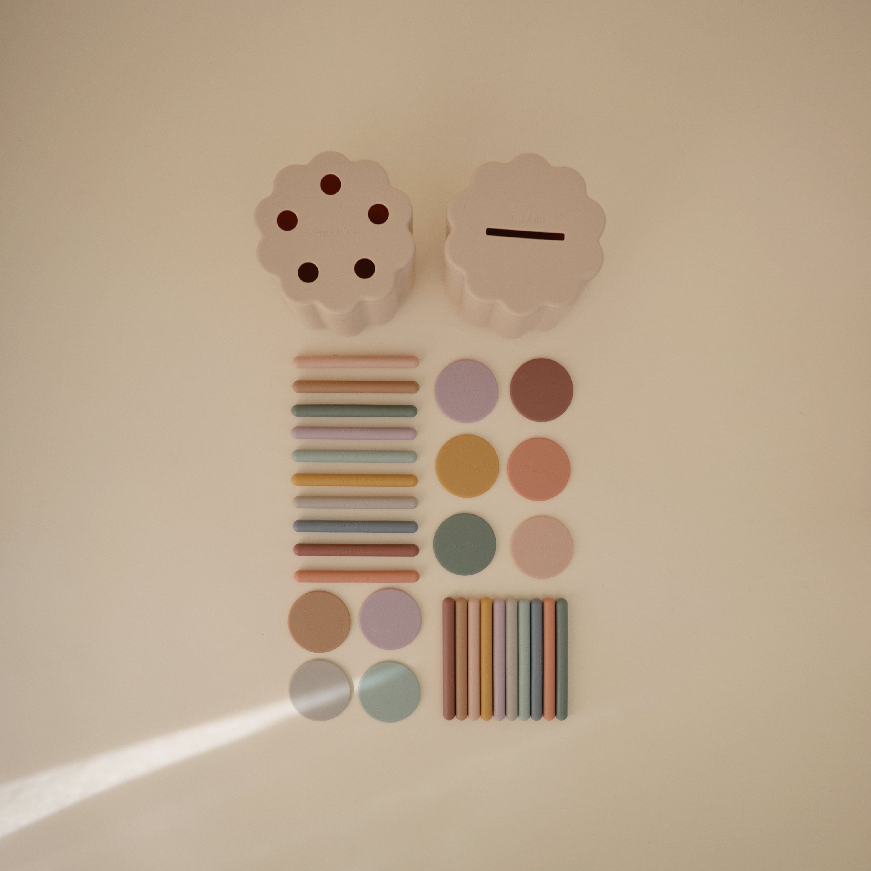 Introduce sorting and matching with our coin & tube sorting box set. The round scalloped box comes with two interchangeable lids and is made of durable PP plastic. As littles fit the 20 colorful coins and tubes through the corresponding openings, they can develop fine motor skills and hand-eye coordination. Whether they're matching or sorting, this versatile toy offers hours of educational play for toddlers.