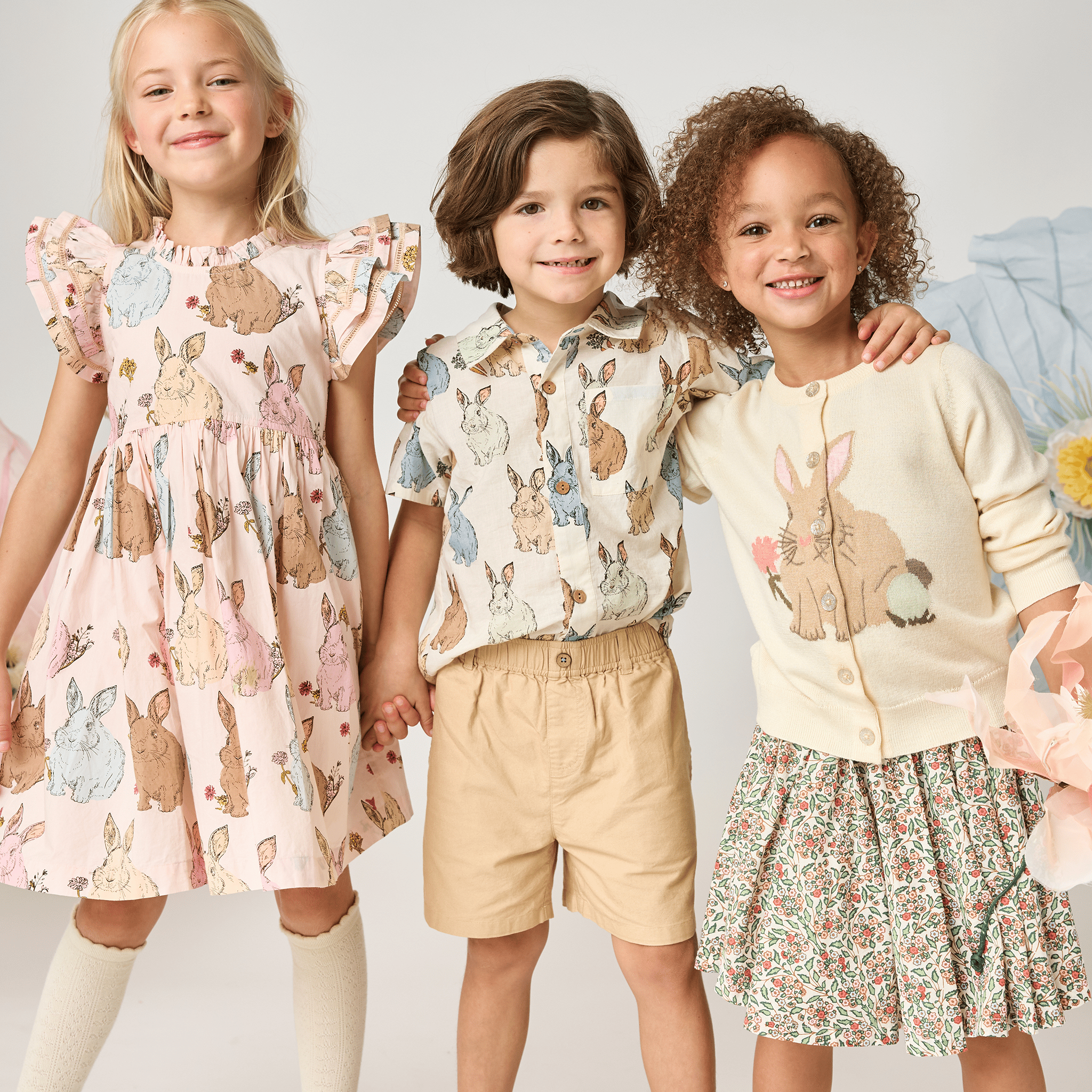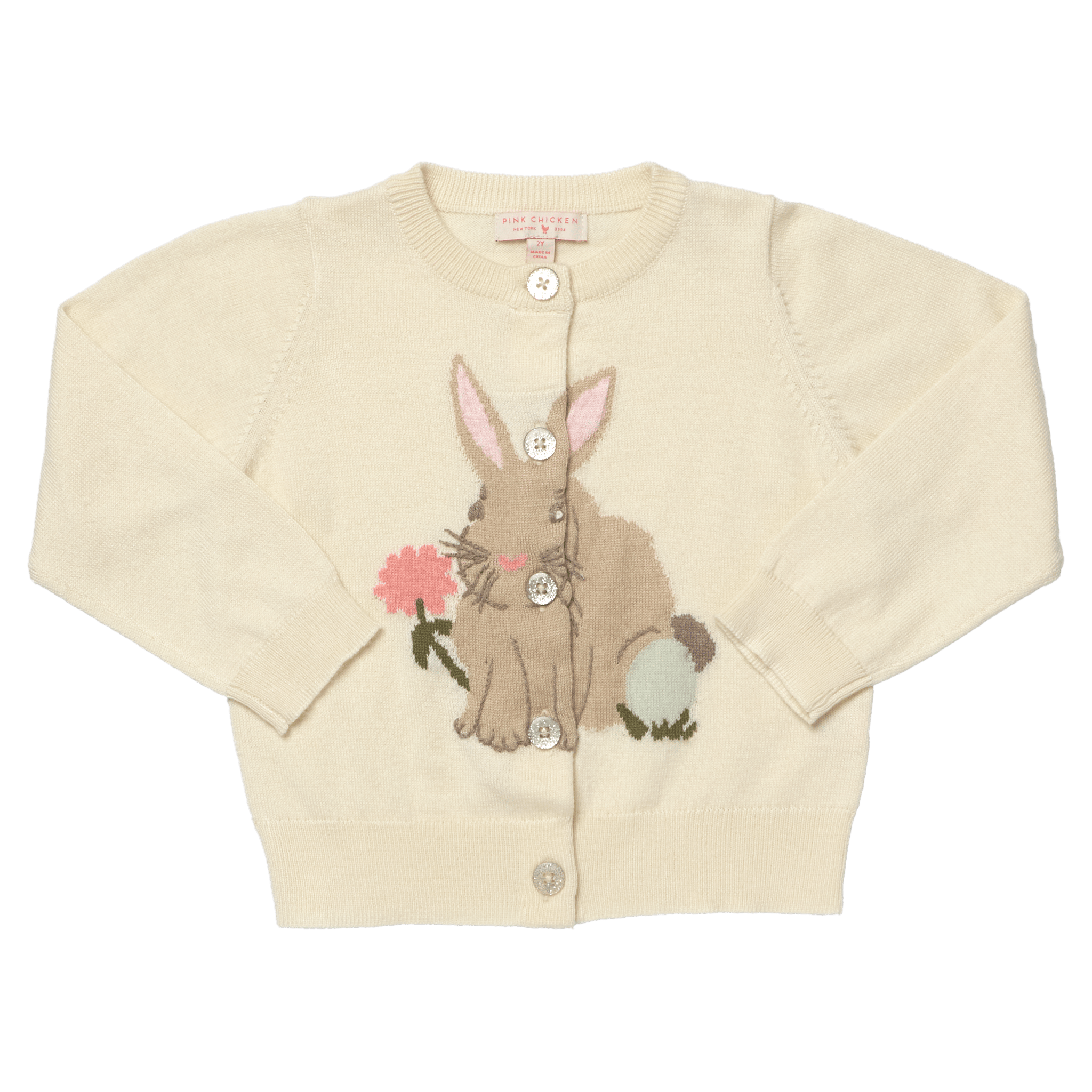 A cozy layer with sweet bunny charm. The Cotton Long Sleeve Maude Sweater features an adorable bunny intarsia design on a soft cream background, finished with subtle glitter buttons for a hint of sparkle. Crafted from soft cotton, this sweater is perfect for layering on cool spring days, Easter outings, and everyday wear.