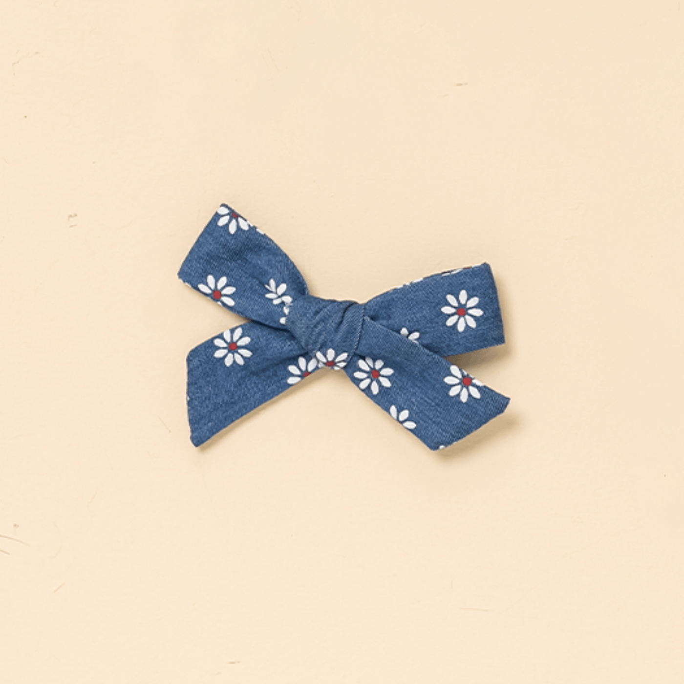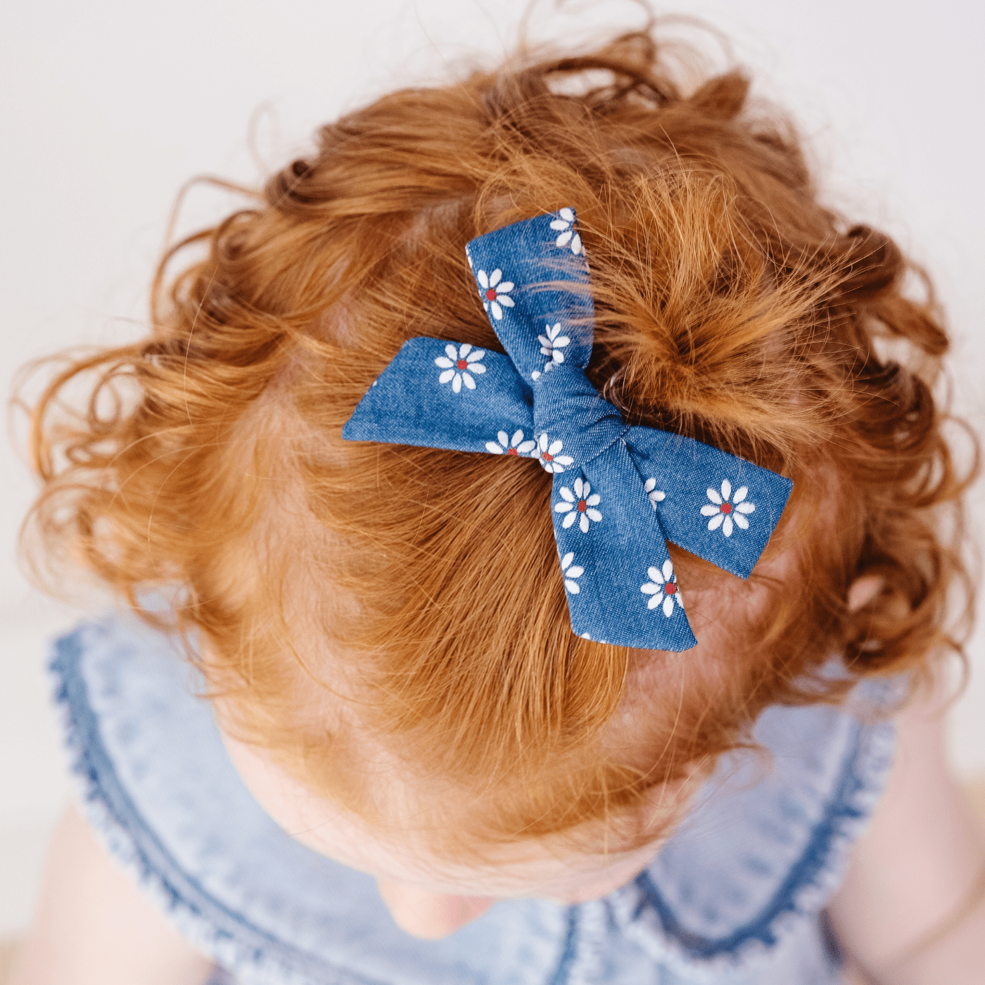The Denim Daisy Bow Clip combines a trendy denim texture with a delicate floral print. A must-have in the popular Poppy style.