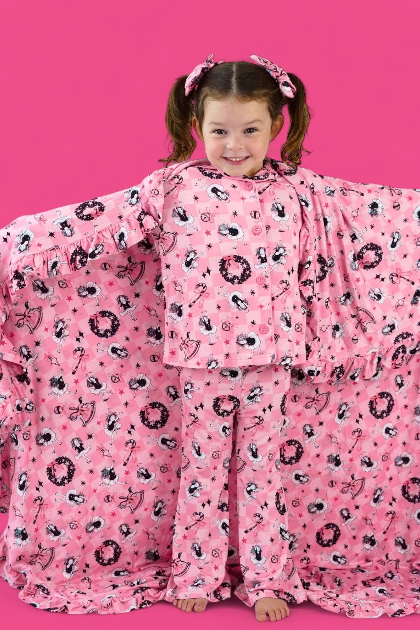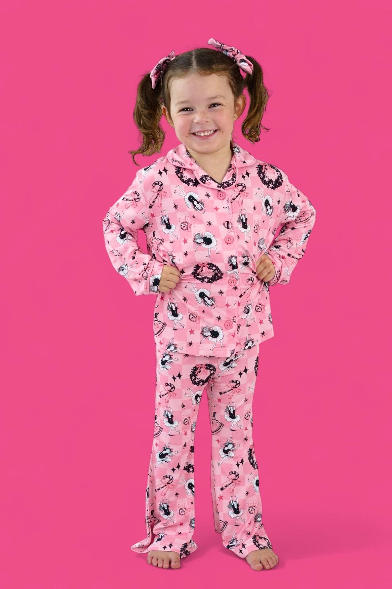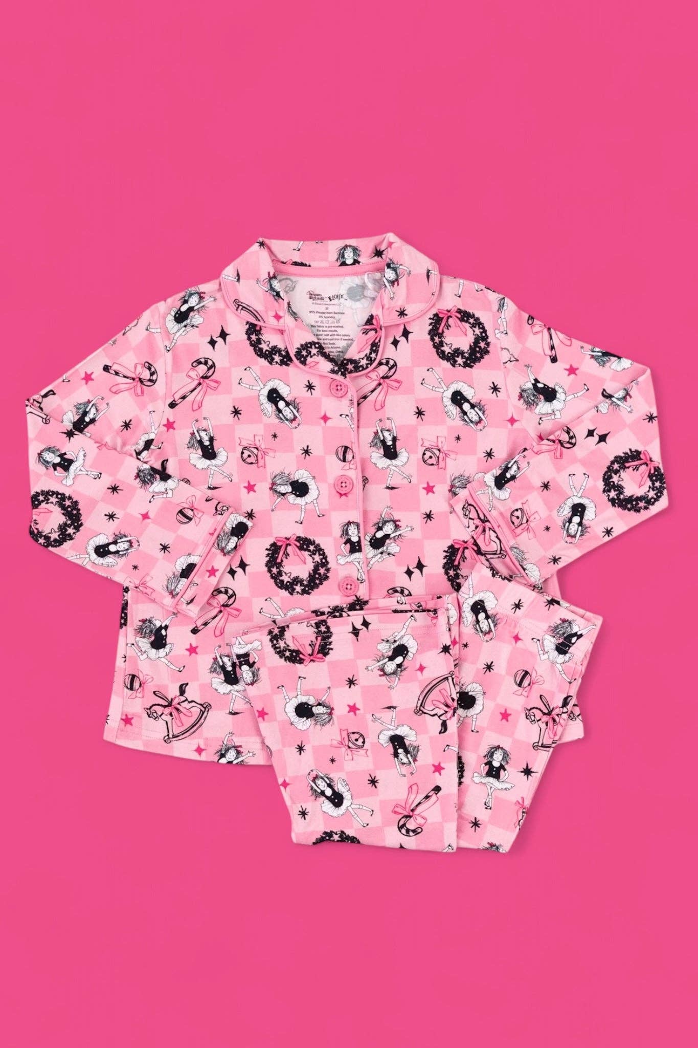 Pirouette through the season in the Eloise Holiday Ballet Dream Girl's Flare Set! This festive pajama set showcases Eloise in her holiday ballet best, dancing across a pink checkerboard sprinkled with wreaths, stars, bows, and ornaments. The cozy long-sleeve top pairs perfectly with flowy flare pants, combining comfort with holiday sparkle. These Eloise at the Plaza pajamas are ideal for bedtime, playtime, and picture-perfect family holiday photos.