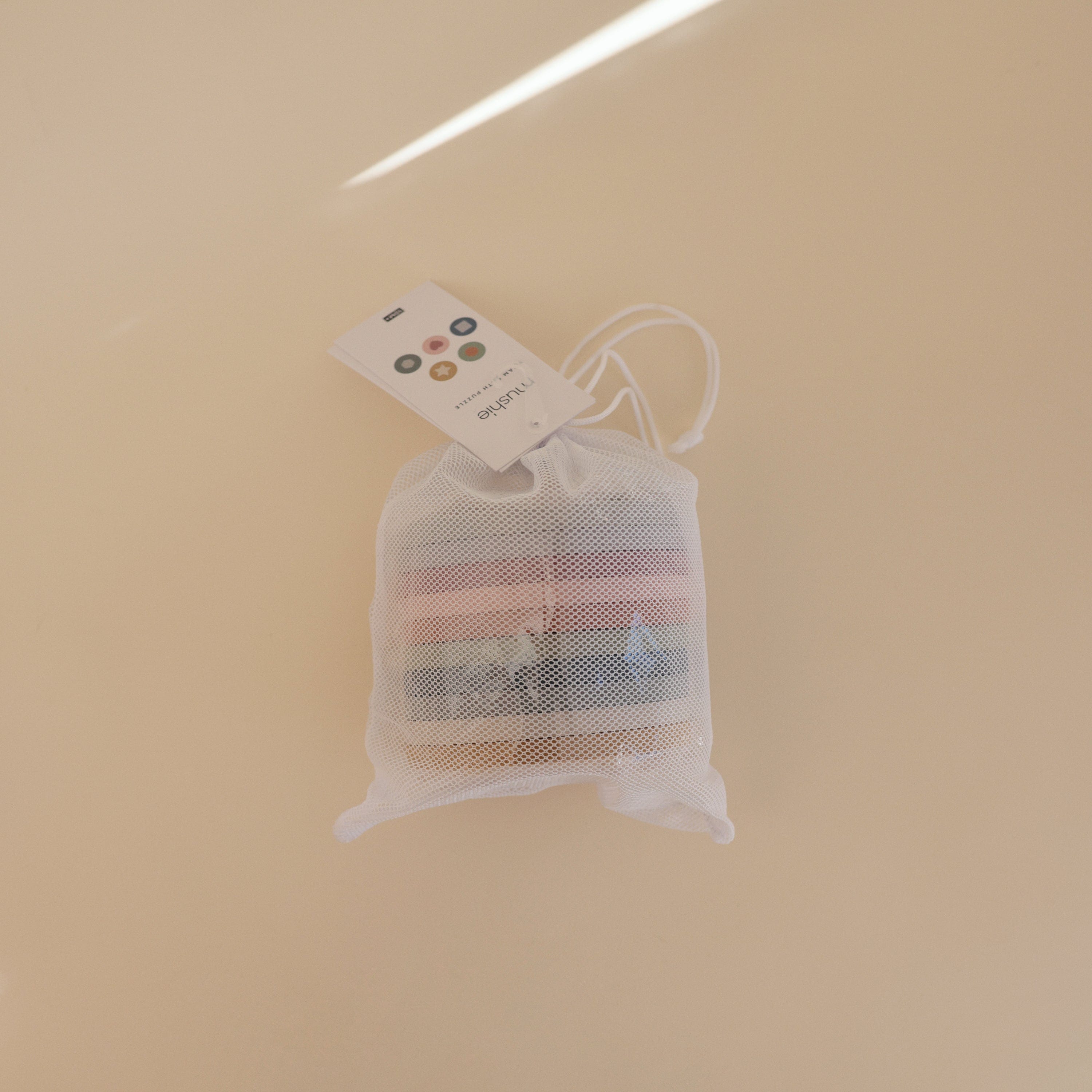 Make a splash during bathtime with Mushie's foam geometric puzzle that mixes learning and play. The pieces easily float on water and stick to bath surfaces, creating engaging activities for children of all ages. Featuring 10 circle pieces with 10 geometric shape cut-outs, this set offers educational benefits like shape and color recognition and improves fine motor skills as littles fit the shapes into their corresponding holes. The set comes with a mesh storage bag to help keep things tidy after bathtime.