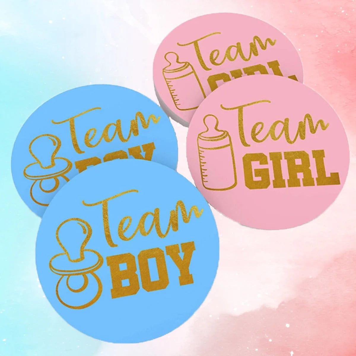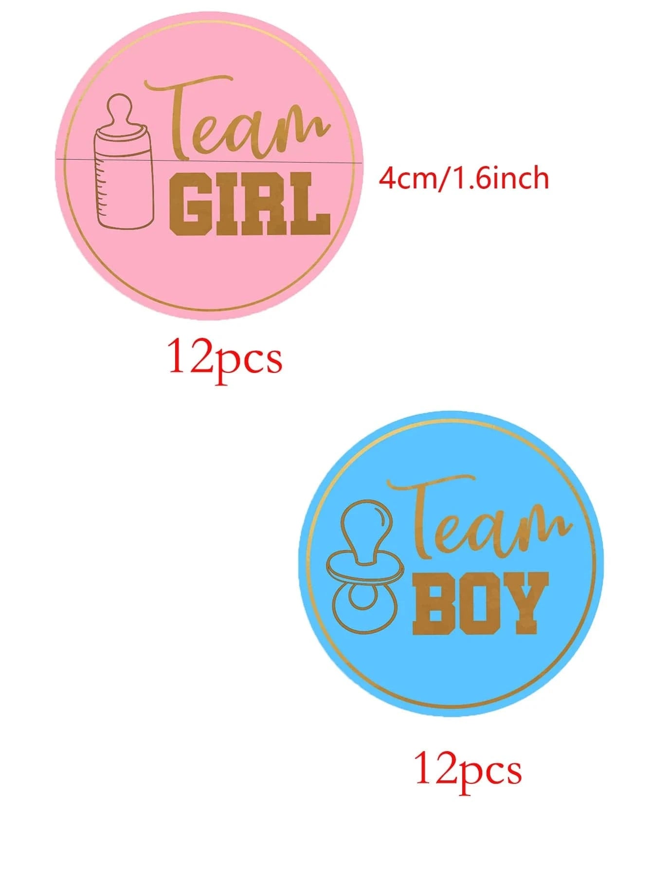 Includes: 24 round stickers (2" each) — 12 for Team Boy and 12 for Team Girl. Each one features a cute baby bottle and nipple design with shiny gold lettering in pink or blue — totally photo-worthy!