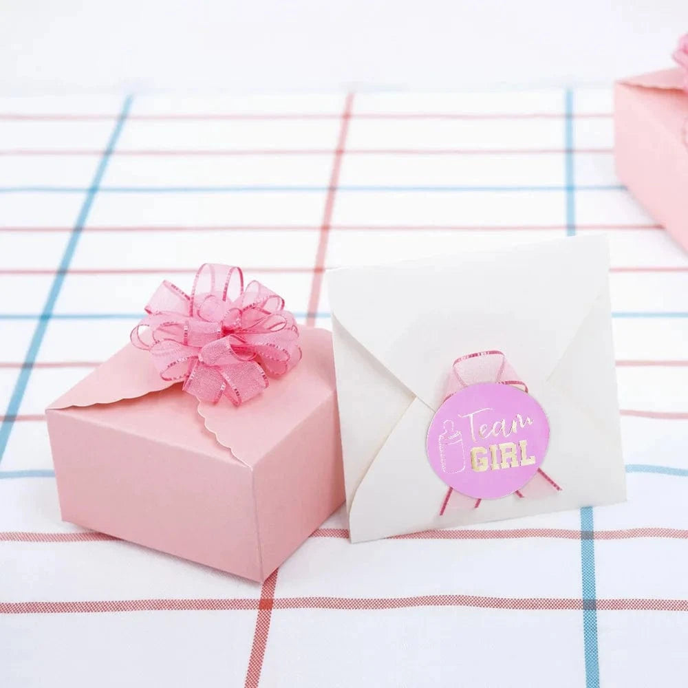 Let the friendly rivalry begin! These adorable Team Boy and Team Girl stickers are the perfect way to get everyone involved in your gender reveal fun.