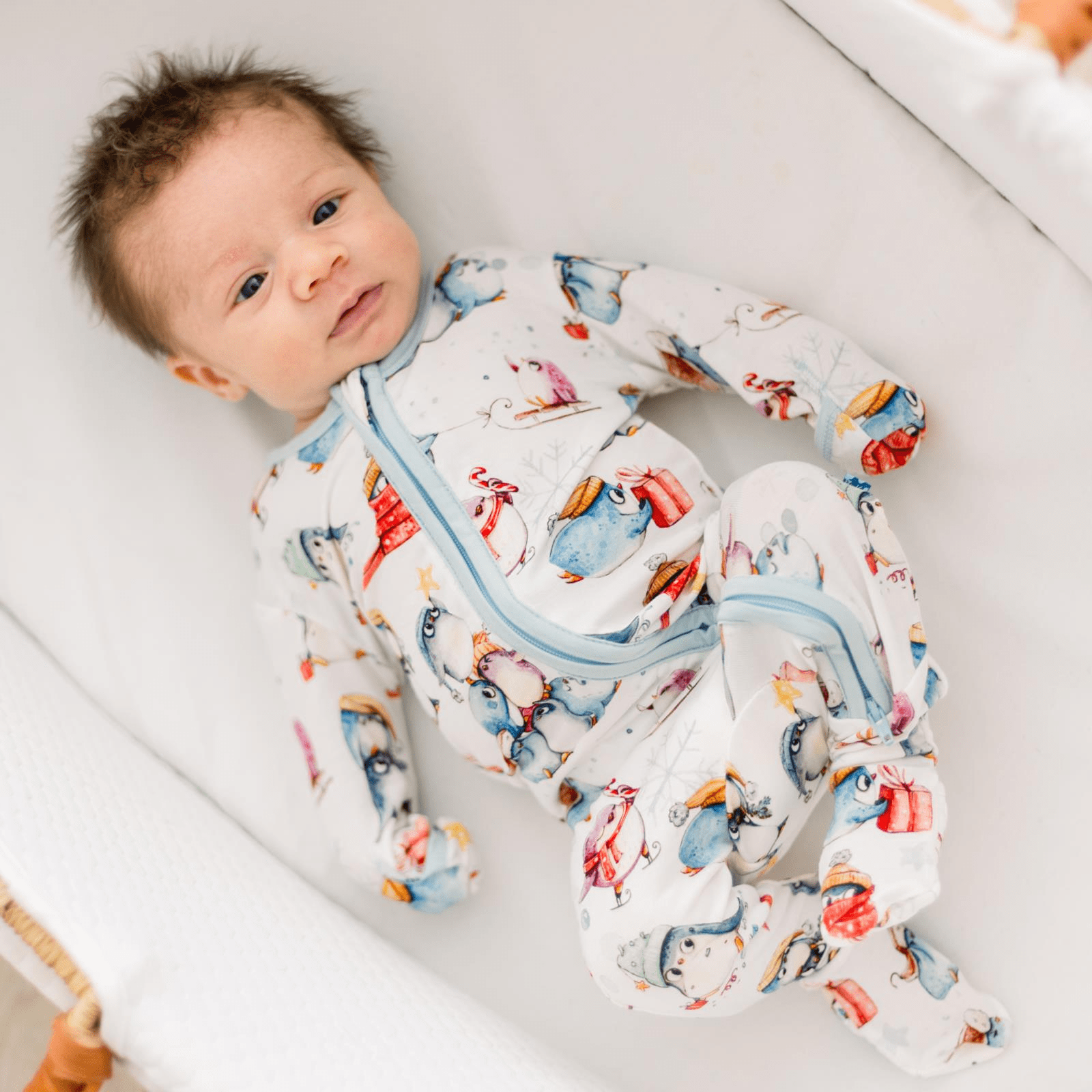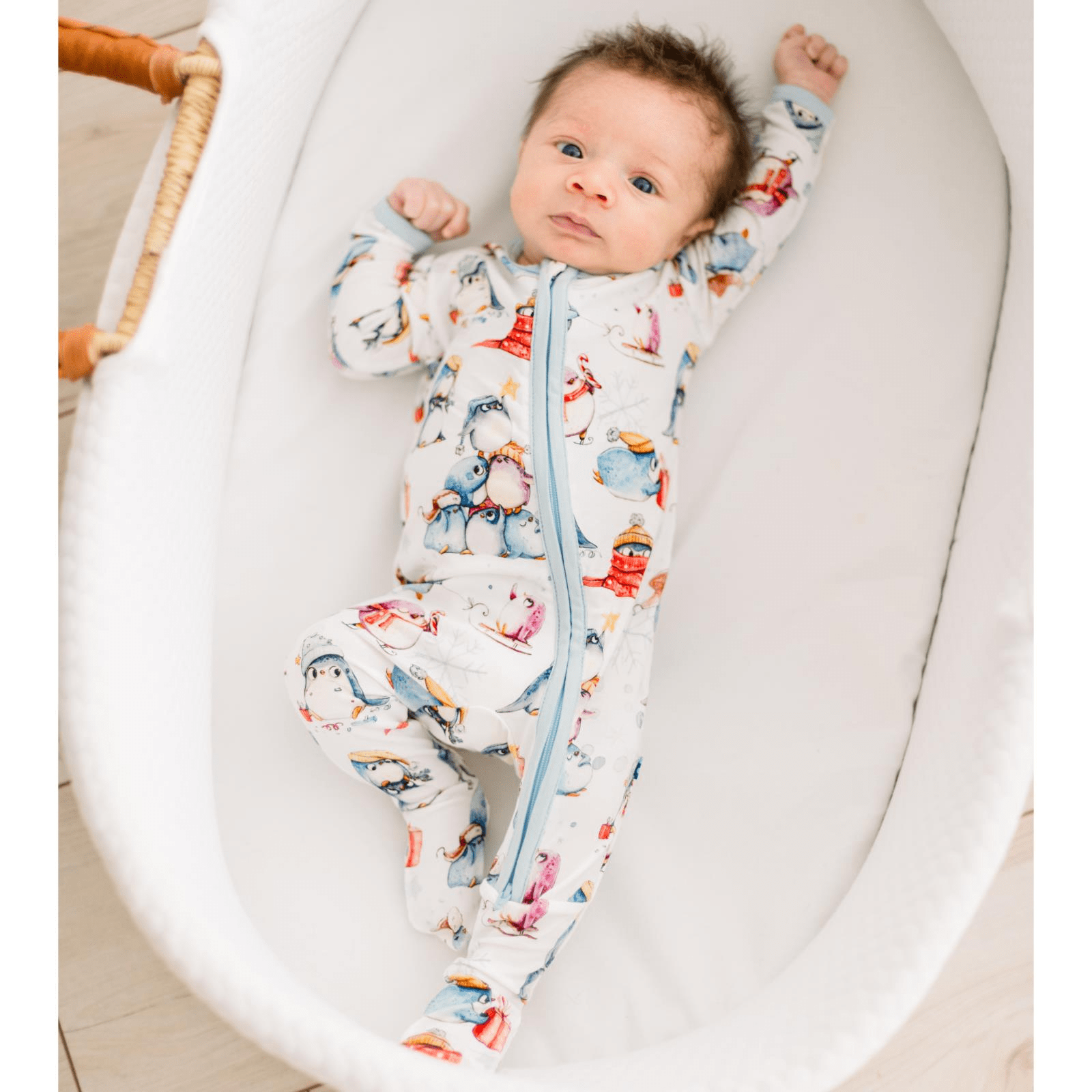 Bamboo Footie with 2-Way Zipper - Natural Silly Penguins