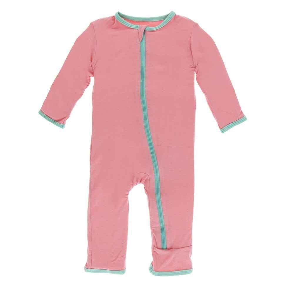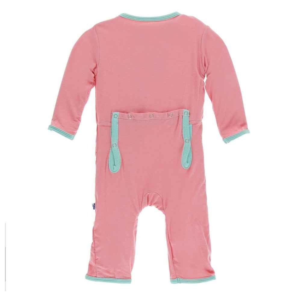 Little ones look so cute in this one piece girls Kickee Pants coverall. This one piece outfit is perfect for play or sleep.