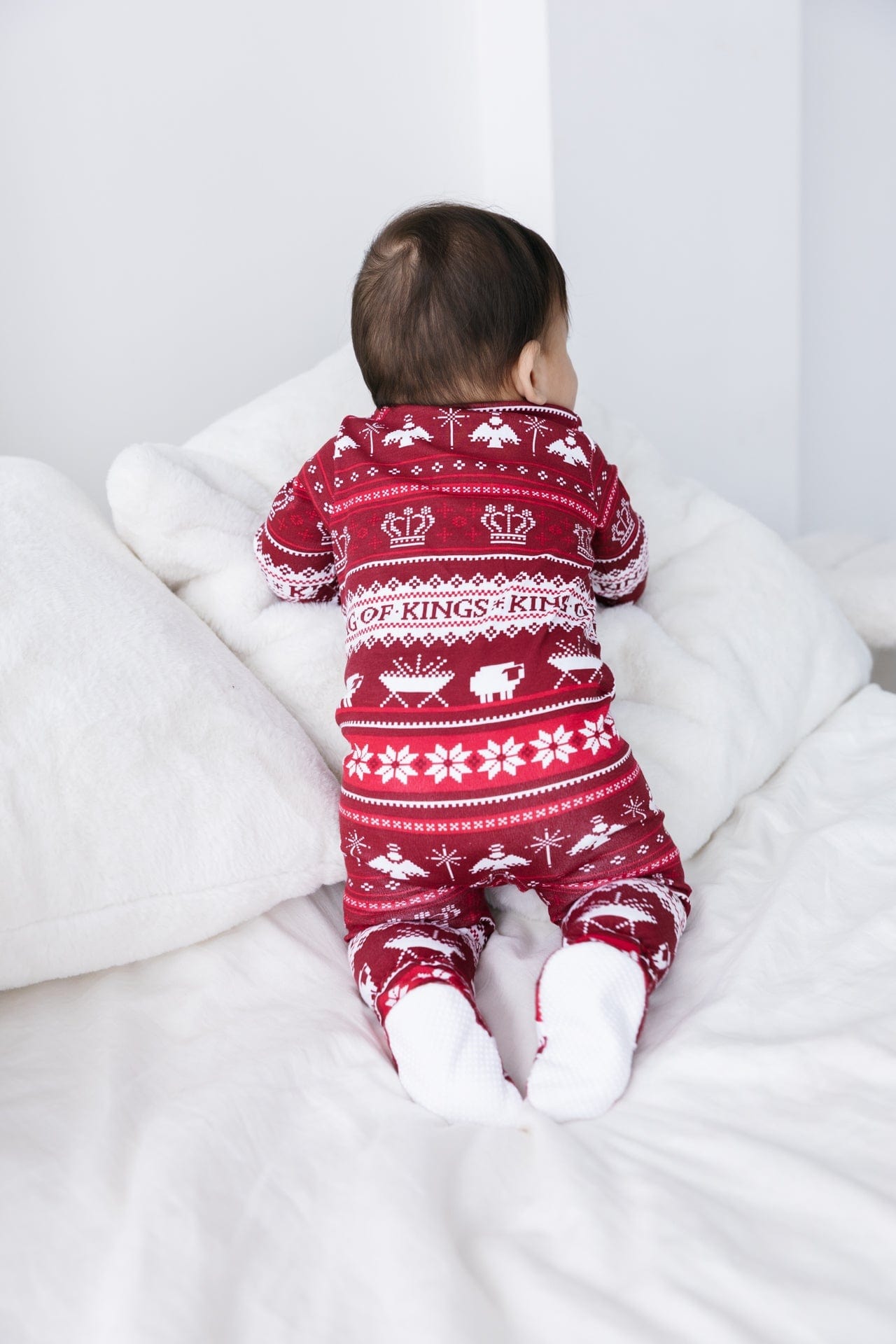 Designed in a cozy Nordic pattern with crowns, manger icons, angels, lambs, stars, and the words KING OF KINGS, this faith-filled print turns every cuddle, nap, and bedtime story into a simple way to point back to Jesus. Our right-arm Scripture label (Luke 2:1–20) makes it easy for parents and grandparents to open the Bible together and keep Christ at the center of the season.