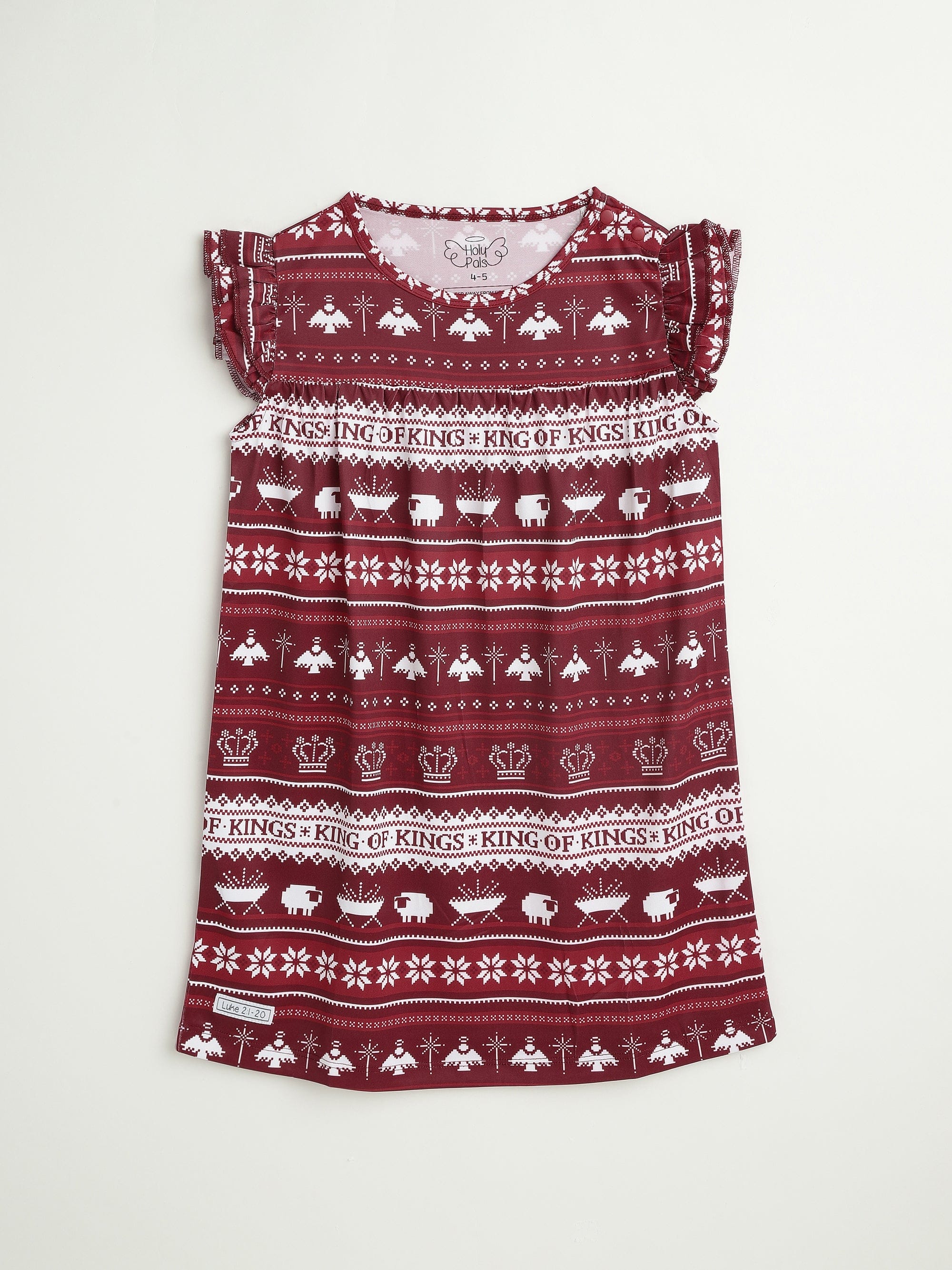 Glory to the newborn King! For the girl who loves a dreamy nightgown, this one is as meaningful as it is beautiful. Our King of Kings Nightgown wraps her in a joyful Nordic print—crowns, manger icons, angels, lambs, stars, and the words KING OF KINGS—so the truth you celebrate stays close all season long. Lightweight and smooth with a flowy A-line shape, it’s designed for cozy sleep and twirl-worthy mornings. And with the right-arm Scripture label (Luke 2:1–20), bedtime becomes a simple way for parents and grandparents to share the story of Jesus’ birth.