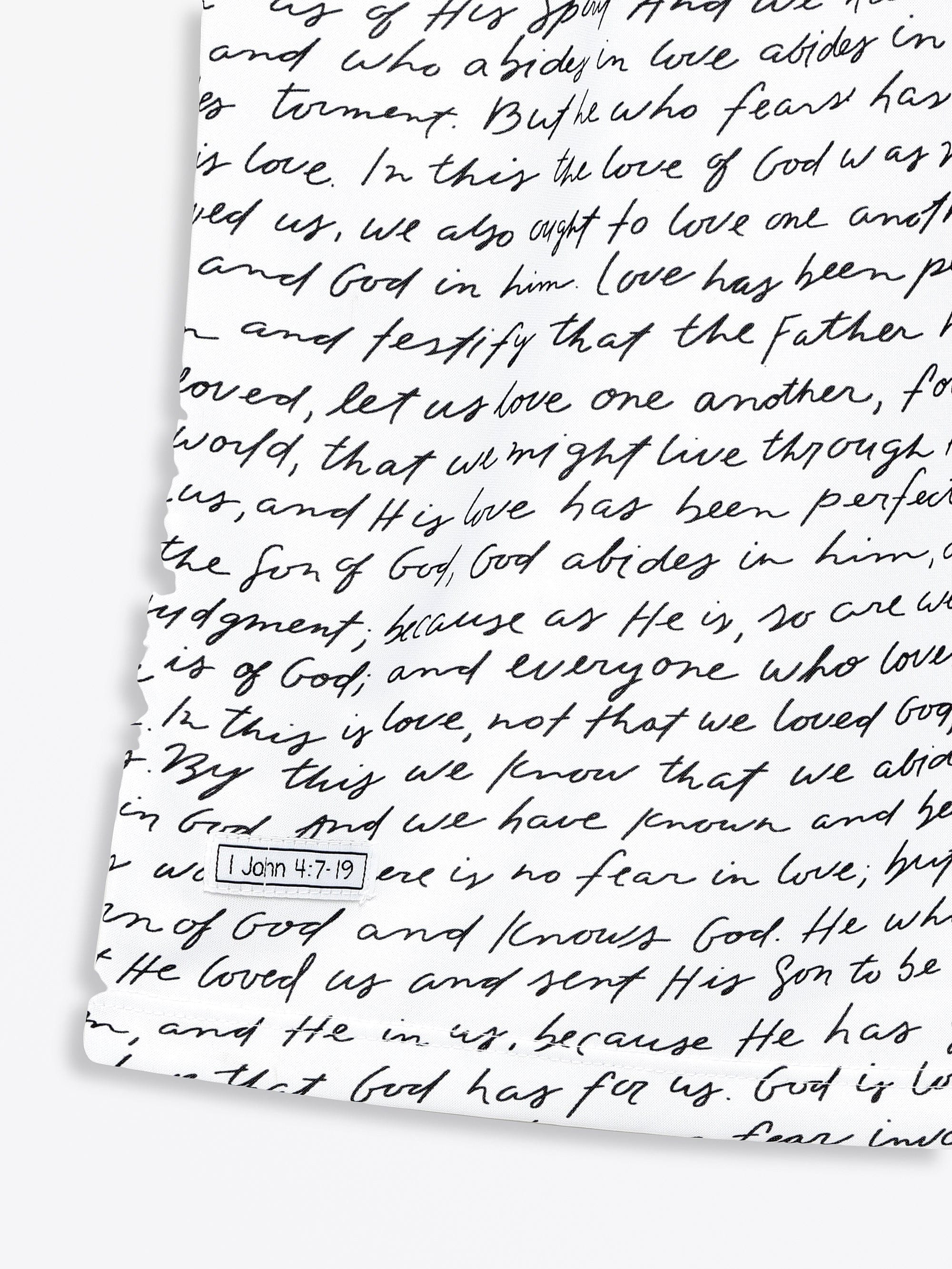 Introducing our stunning 2026 signature print, "Love One Another," based on the fundamental Christian passage 1 John 4:7–19, which deeply focuses on God and His love. This special design was created to literally "wrap your family in the Word of God," featuring the full Scripture text, which was custom-written by an artist exclusively for Holy Pals. It is heartwarming to be wrapped literally in this beautiful, intentional design, which took months to perfect. This Scripture sleepwear serves as a constant, comforting reminder that “God is love” and we are called to “love one another.”