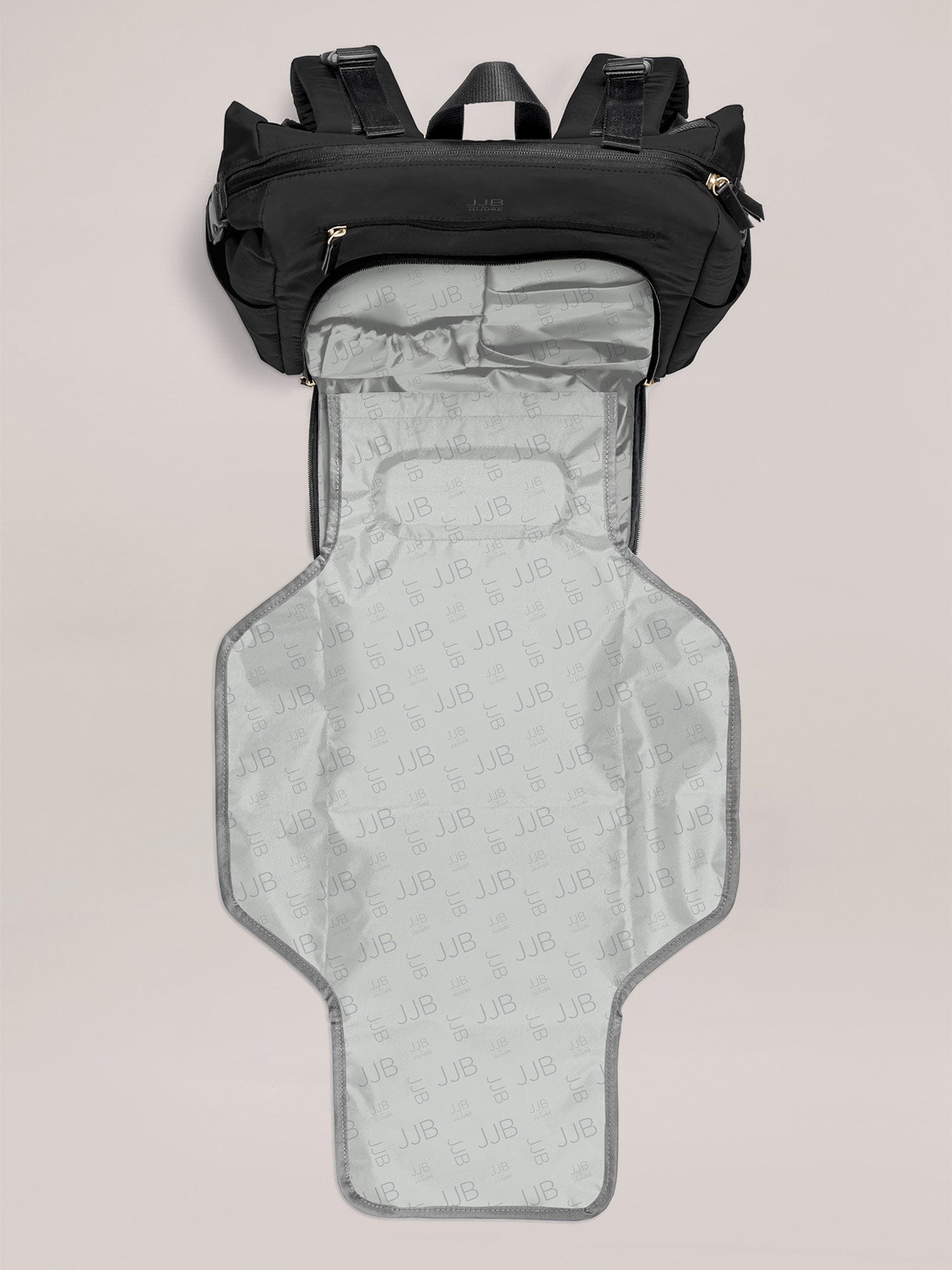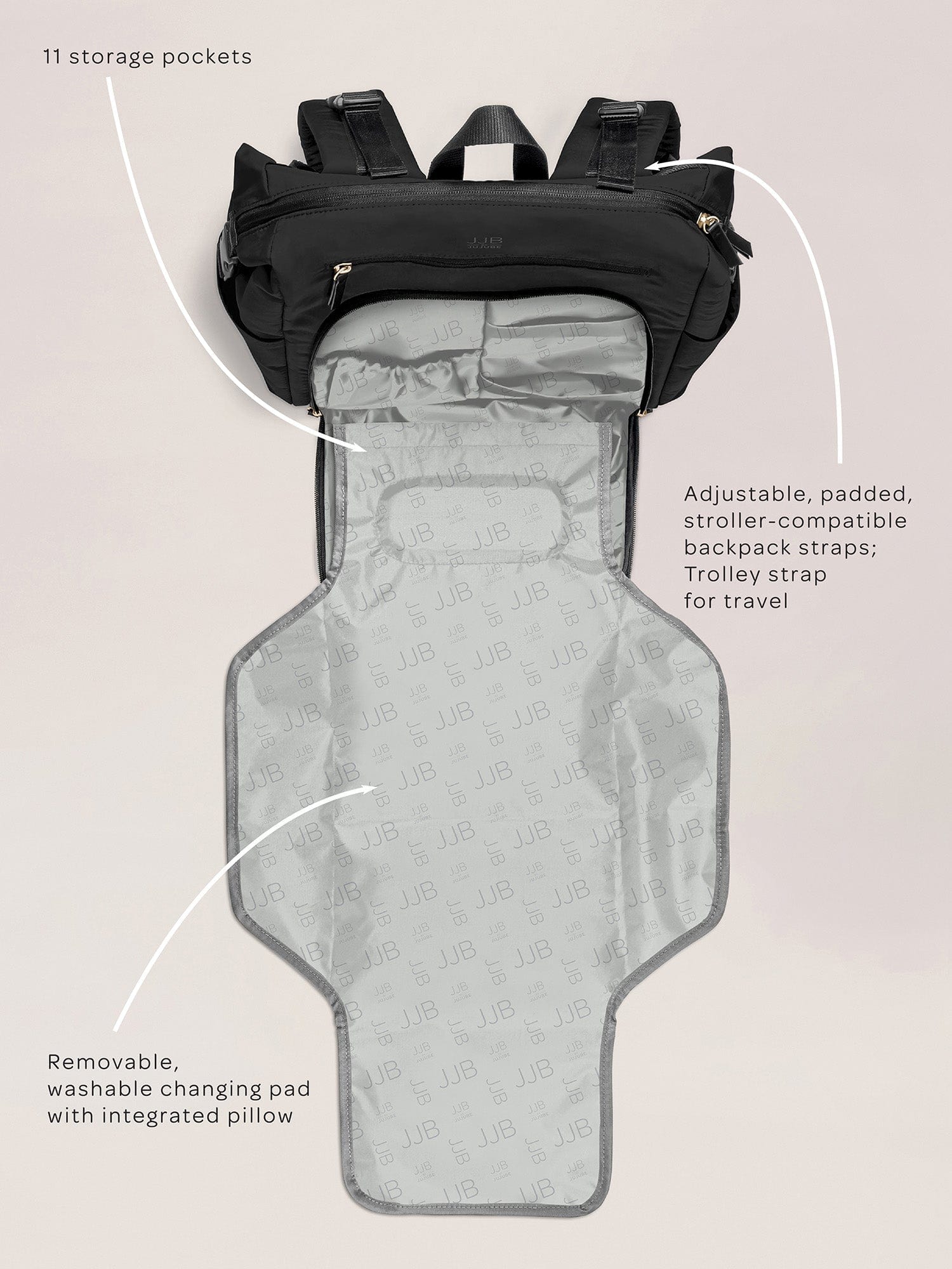Navigate parent life in style (and comfort!) with the sleek and lightweight Modern Backpack from JJB by JuJuBe. The front-pocket changing station includes a washable changing pad with an integrated pillow for Baby’s comfort, and the 11 storage compartments allow you to find what you need in a flash. This includes an insulated bottle pocket in the main compartment with a bungee drawstring to secure any sized bottle. The backpack’s padded shoulder straps adjust to fit you perfectly, while the integrated stroller straps and trolley strap allow you to easily transition the bag onto a stroller or suitcase for more carefree travel with your little one.