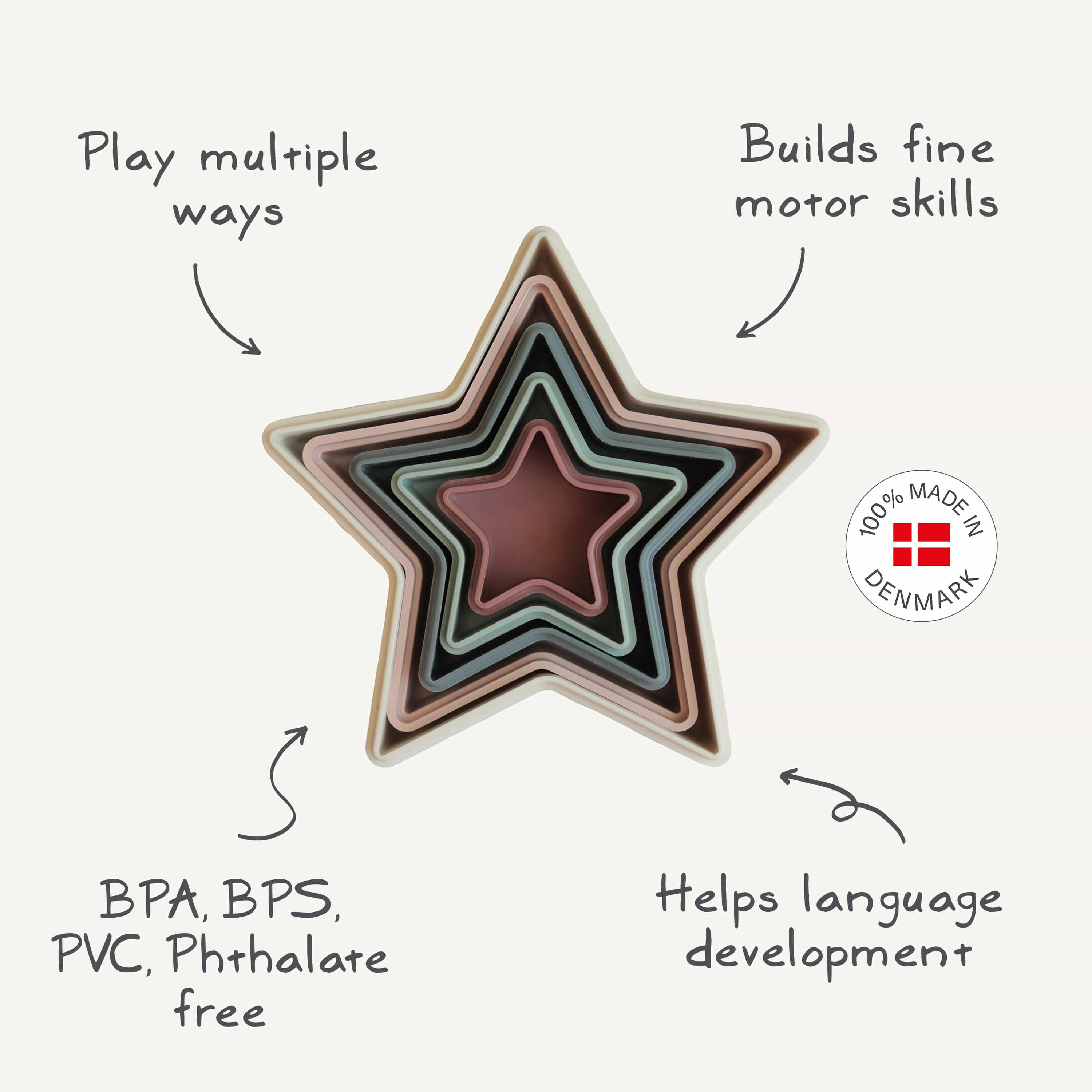 Shooting stars are lighting up the Danish town of Aarhus to make their way to your child's playroom. Little ones will love matching the muted colors while exploring their fine motor skills with this beautiful nesting star toy set.