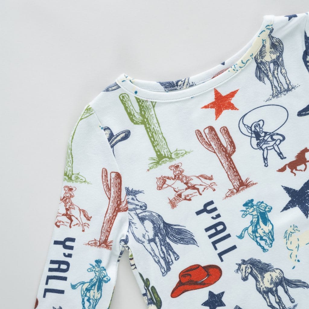 The Bamboo Long Sleeve Pajama Set in Western Dreams adds a playful western inspired print to classic bedtime comfort. Crafted from ultra soft bamboo fabric with a smooth, silk like feel, this cozy kids pajama set is designed for restful nights and relaxed mornings. The breathable bamboo blend helps keep little ones comfortable year round. The two piece set includes a long sleeve top and elastic waist pants, making it an easy favorite for bedtime, lounging, and weekend wear.