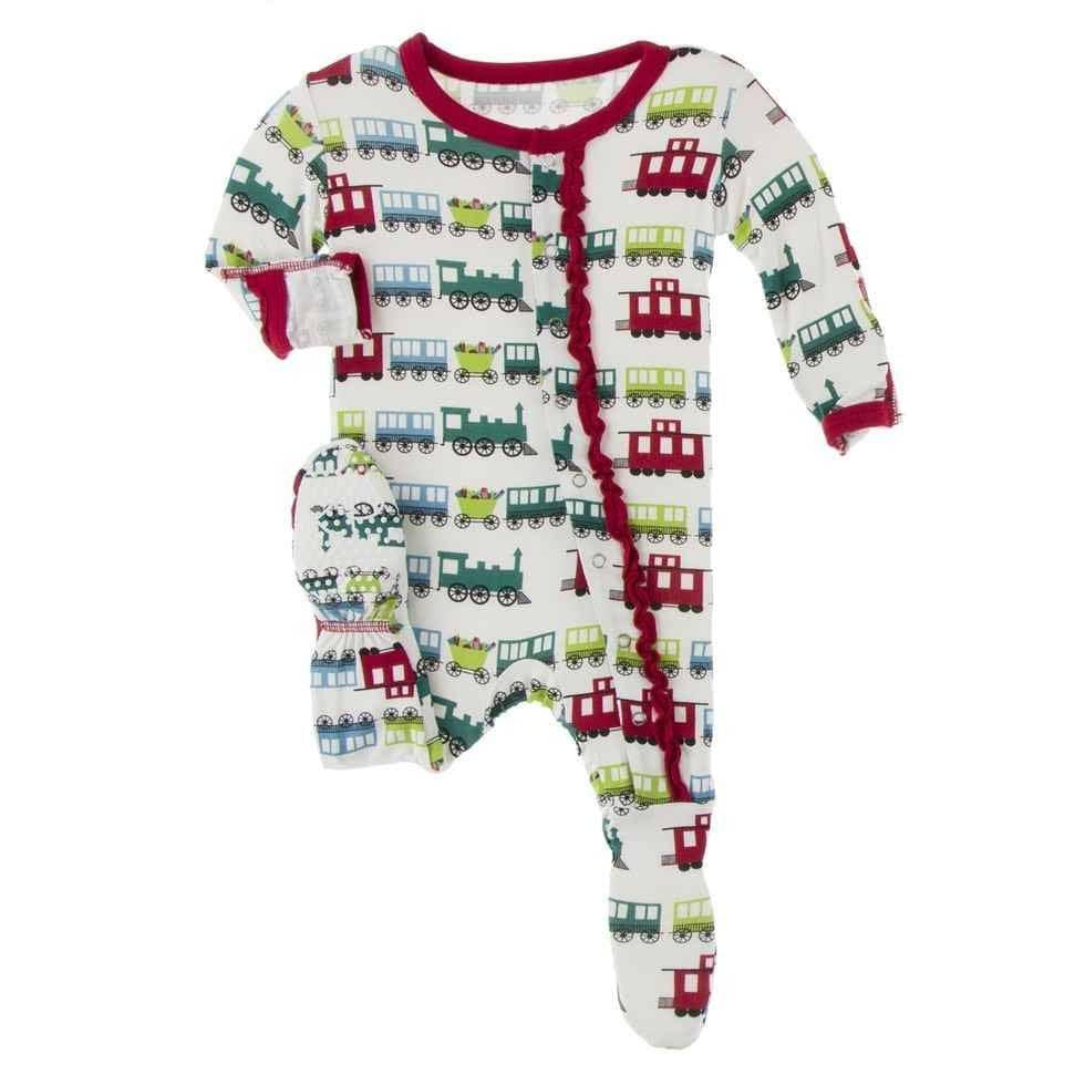 Print Bamboo Muffin Ruffle Footie with Snaps - Natural Toy Train