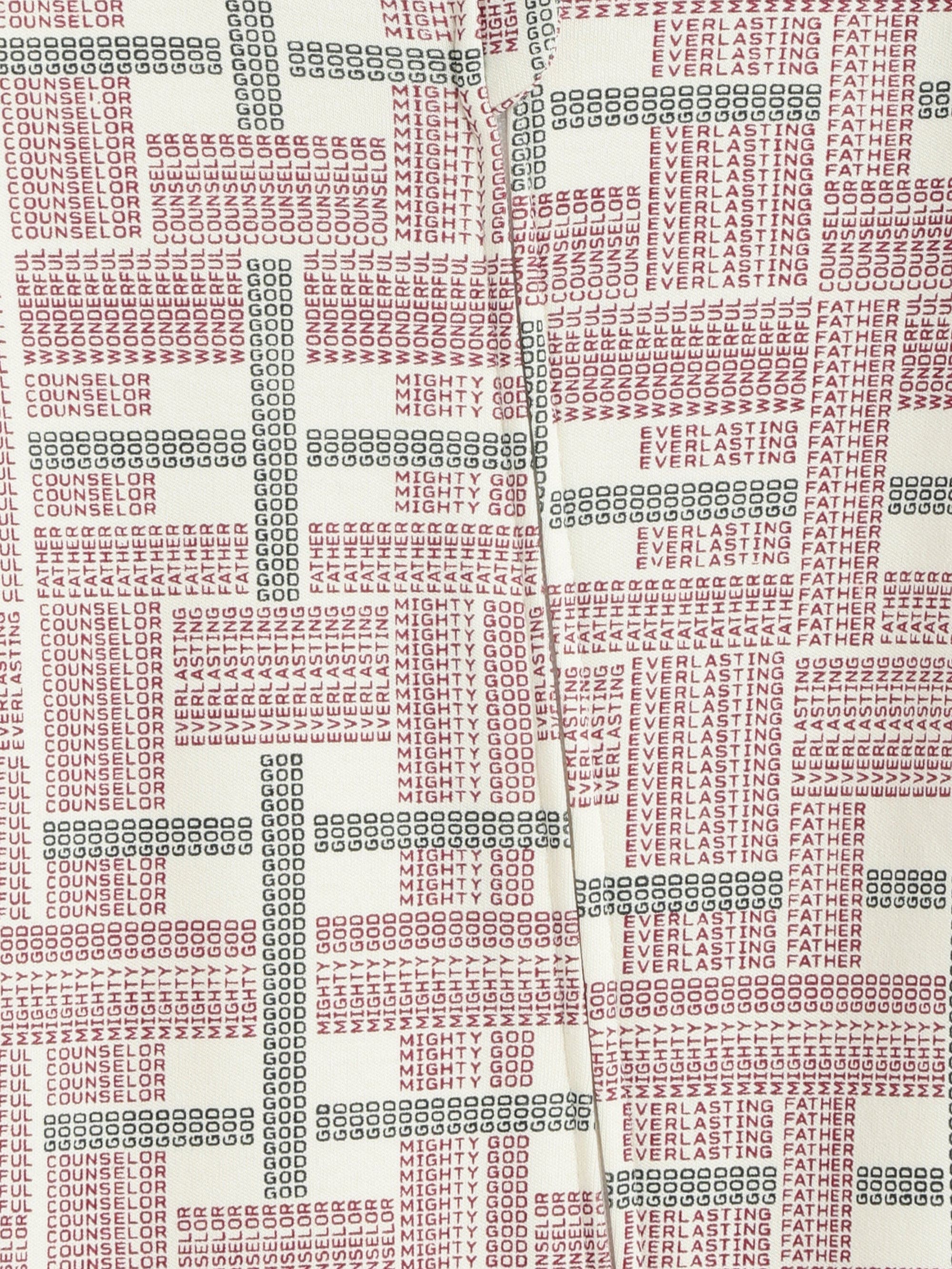 • Prophecy in the pattern — Isaiah 9:6 text forms the plaid (Wonderful Counselor, Mighty God, Everlasting Father).