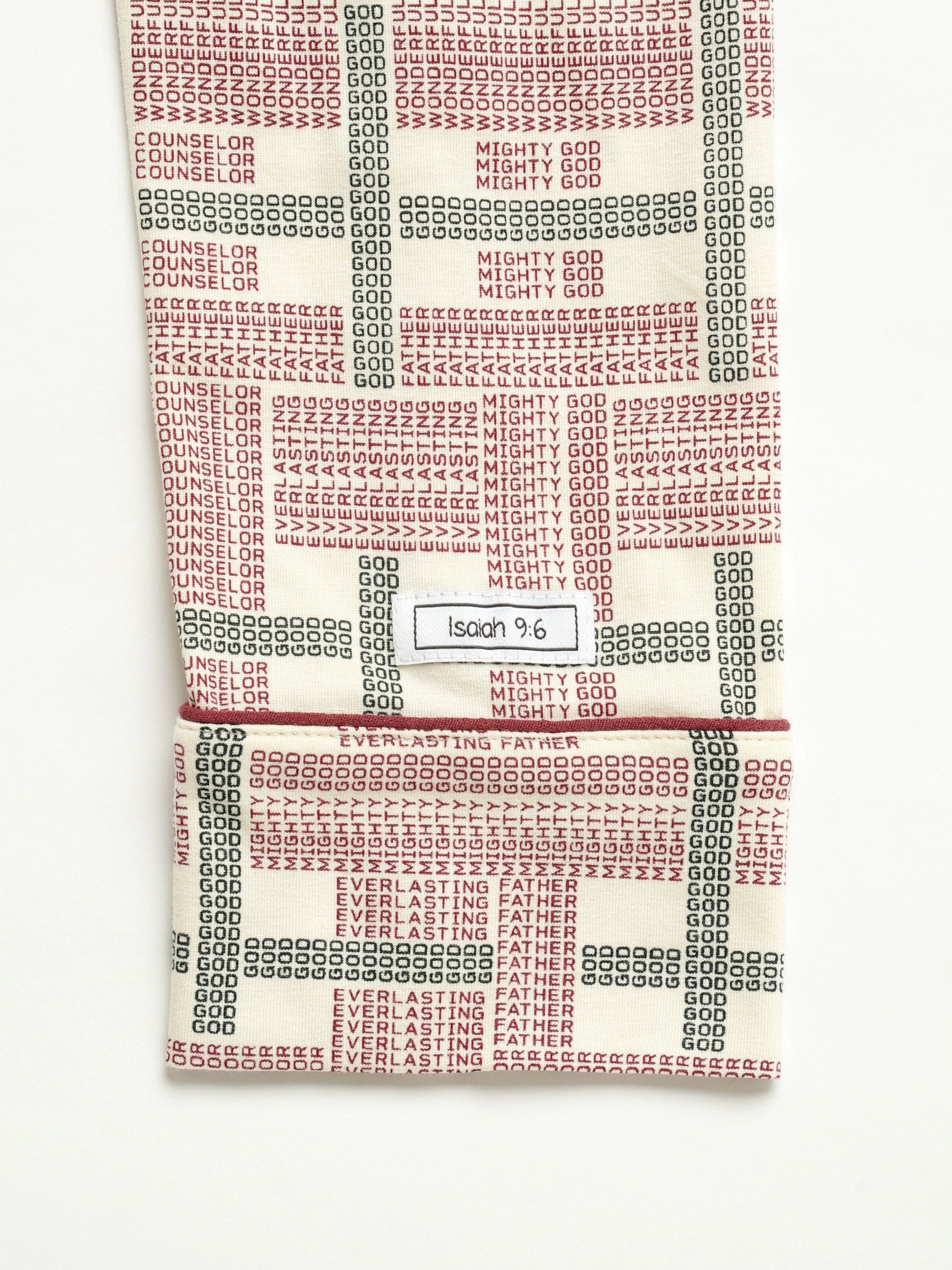 A plaid with a purpose. We took Isaiah’s prophecy—“For to us a child is born…”—and stitched it into the pattern so the names of Jesus form the very weave. It looks like a classic holiday plaid from afar; up close, Scripture appears—turning cozy moments into simple chances to teach and celebrate what Christmas is all about.