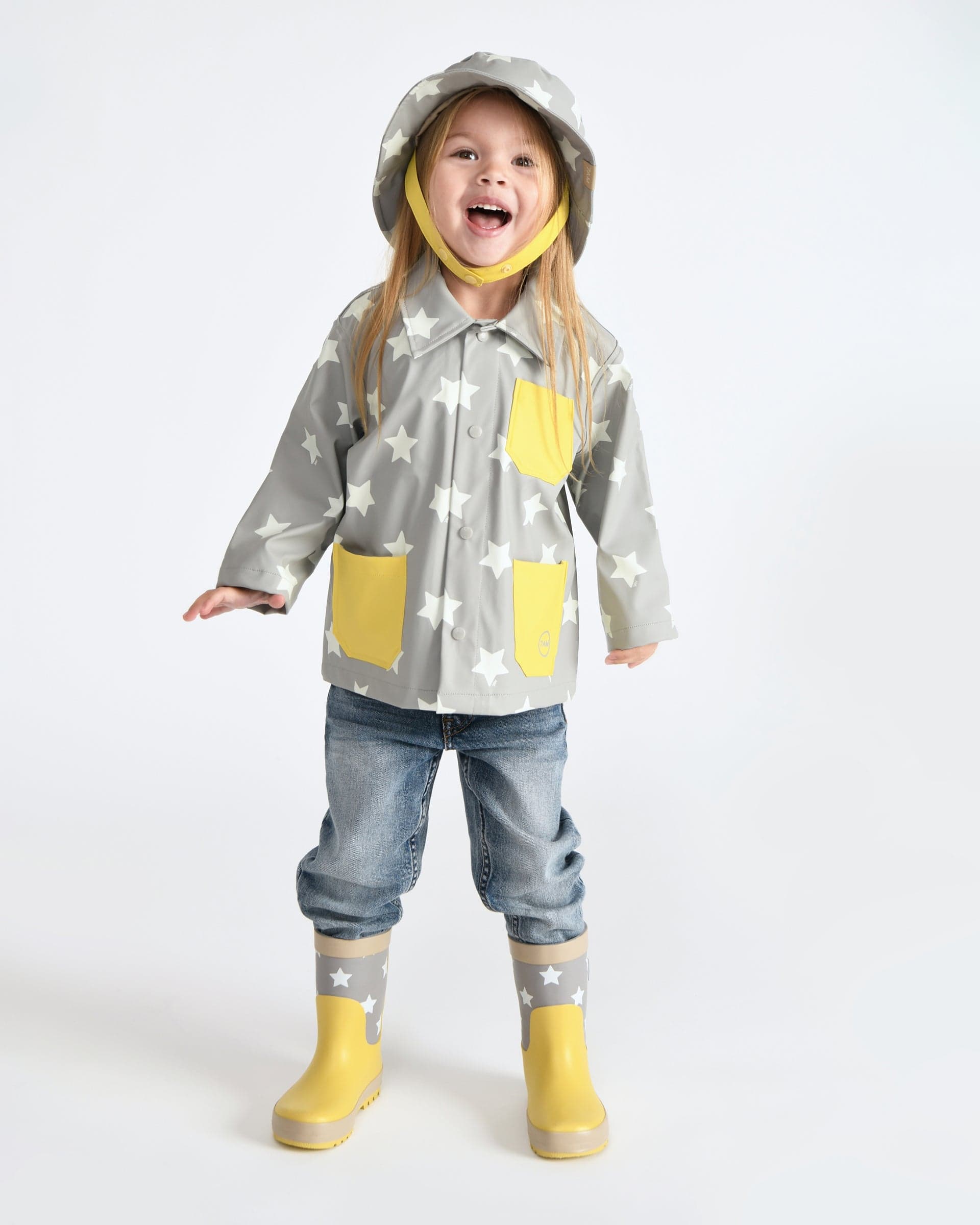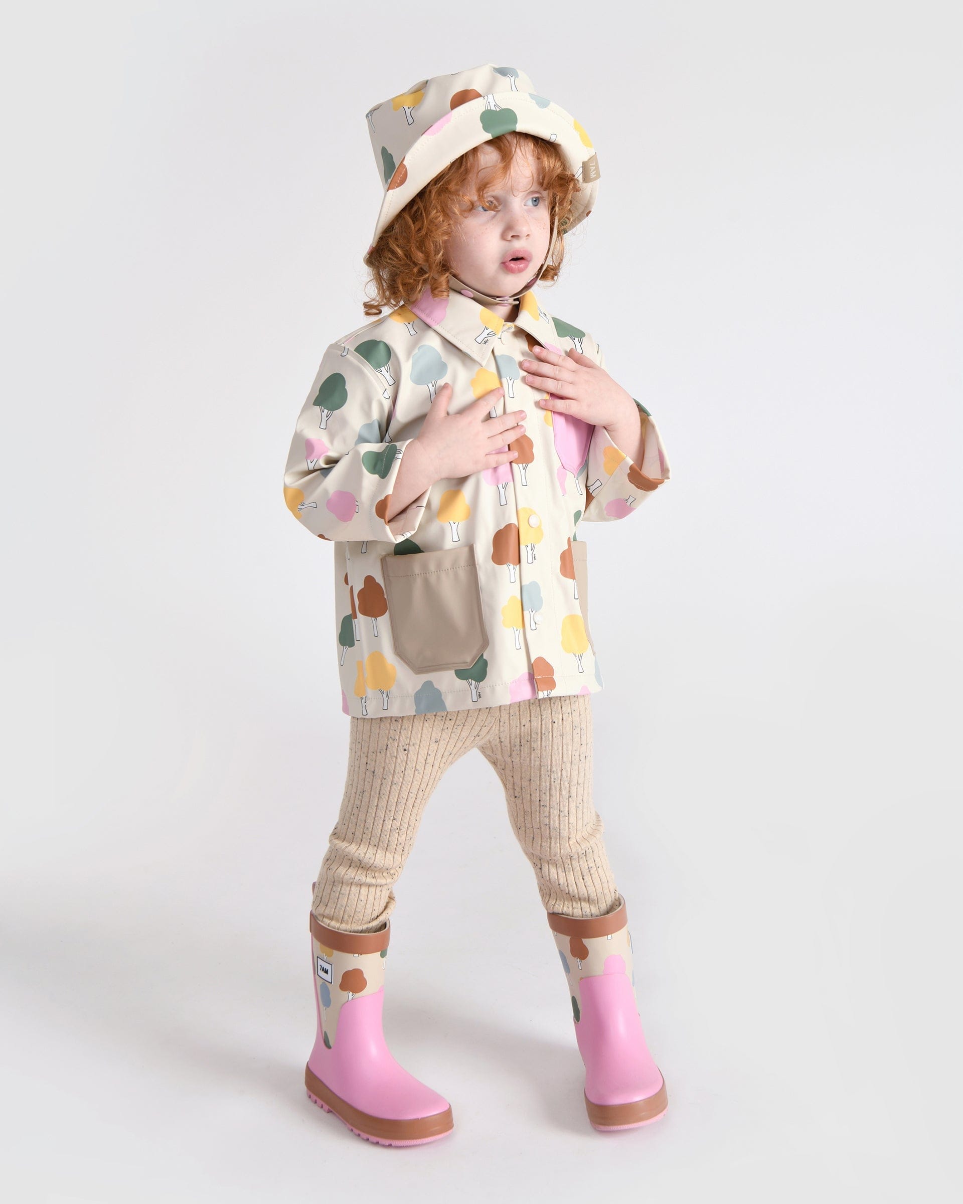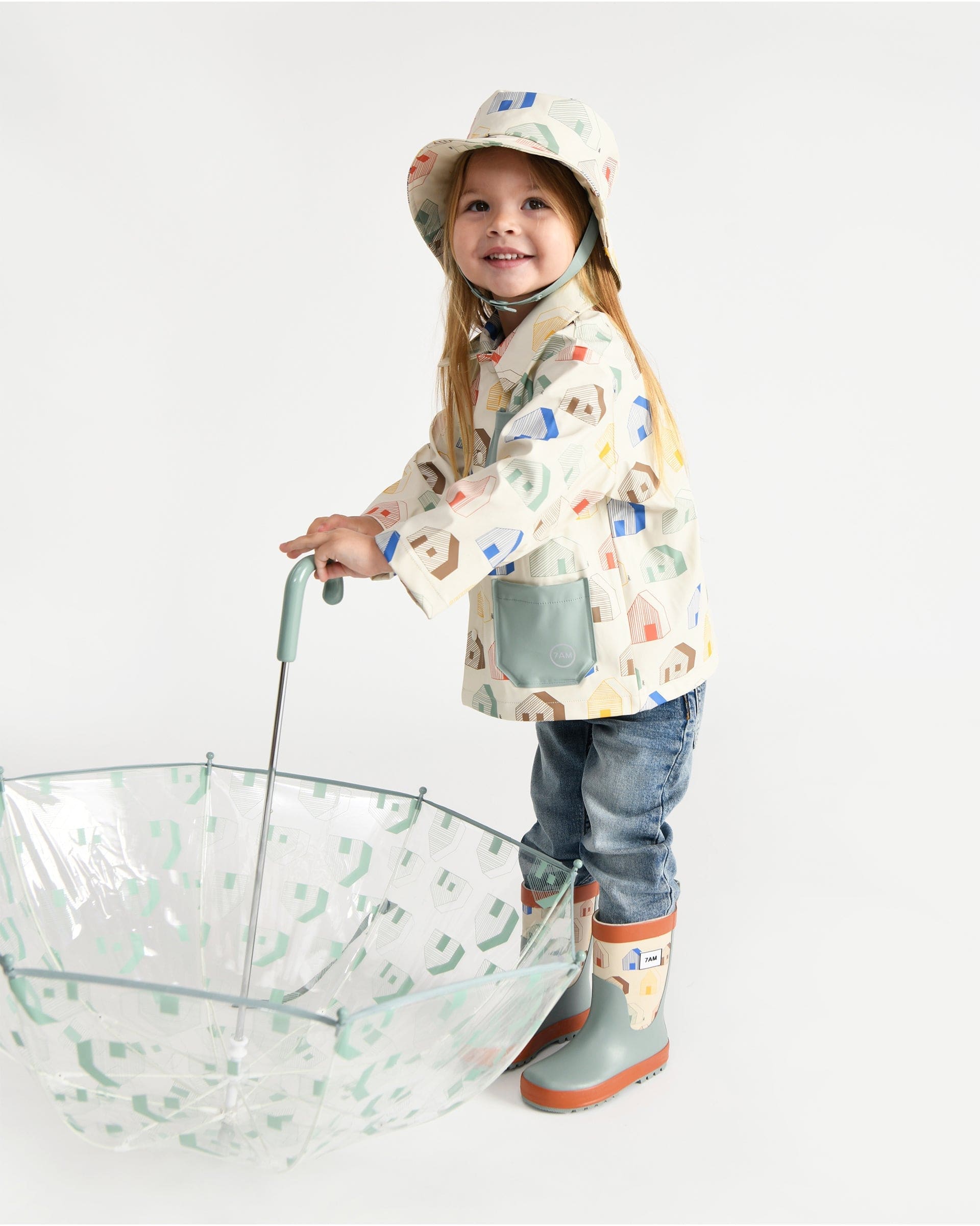 Pitter-patter, hands in pockets, feet in boots. The smell of spring is upon us; let's skip into the rain, mouth open catching every drop, and splash under the storm! Boots, hooded raincoats, overalls, and bucket hats— these new pieces are slipped on before “singing in the rain” and jumping into puddles. The clean cuts, soft tones, and cheerful prints from our Rainwear Collection will make frogs pale with envy and snails salivate with adoration.
