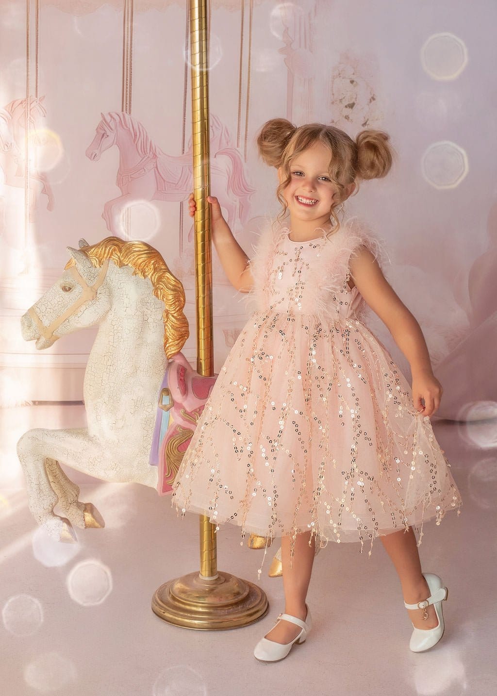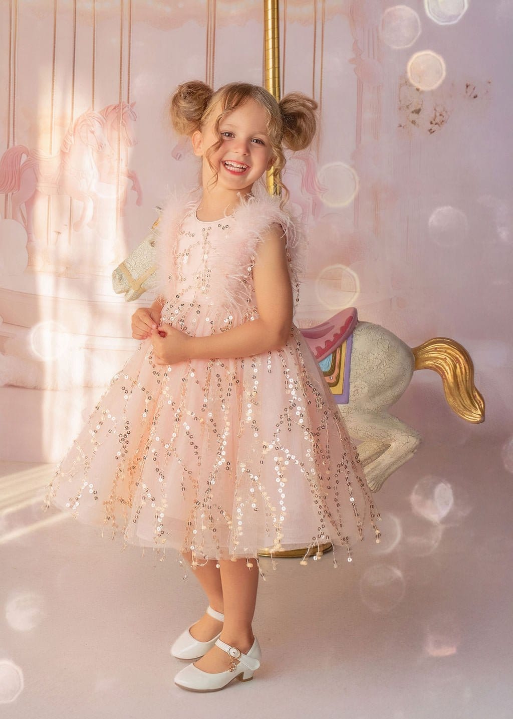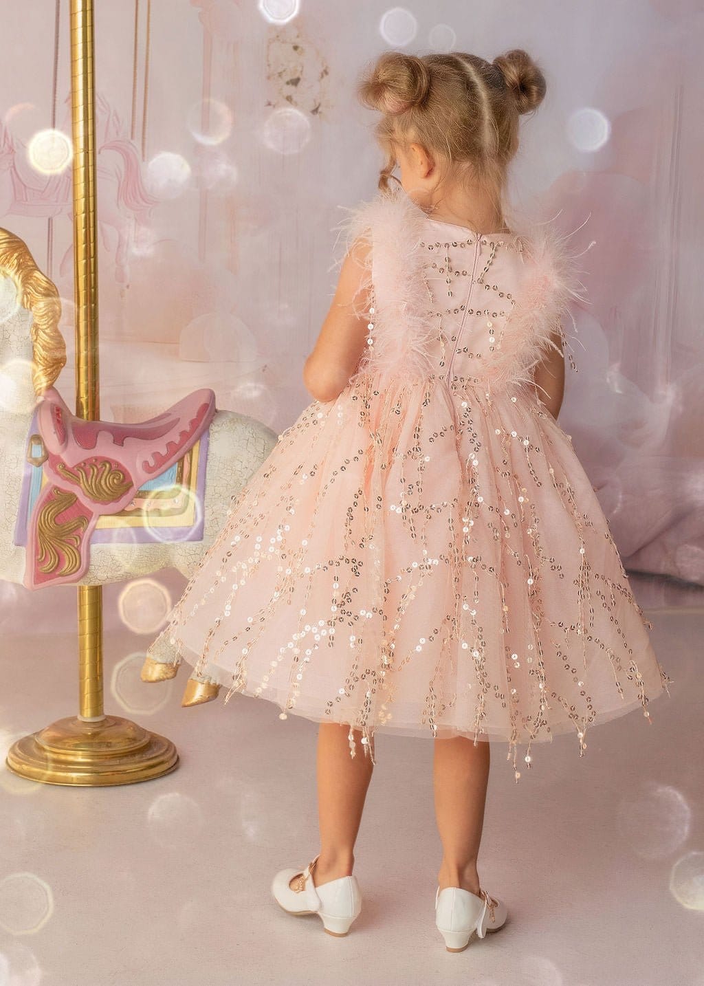 Designed for moments that sparkle, this magical dress features a dreamy blush pink hue, dazzling sequin embellishments, and whimsical feathered shoulders for an extra touch of glamour.