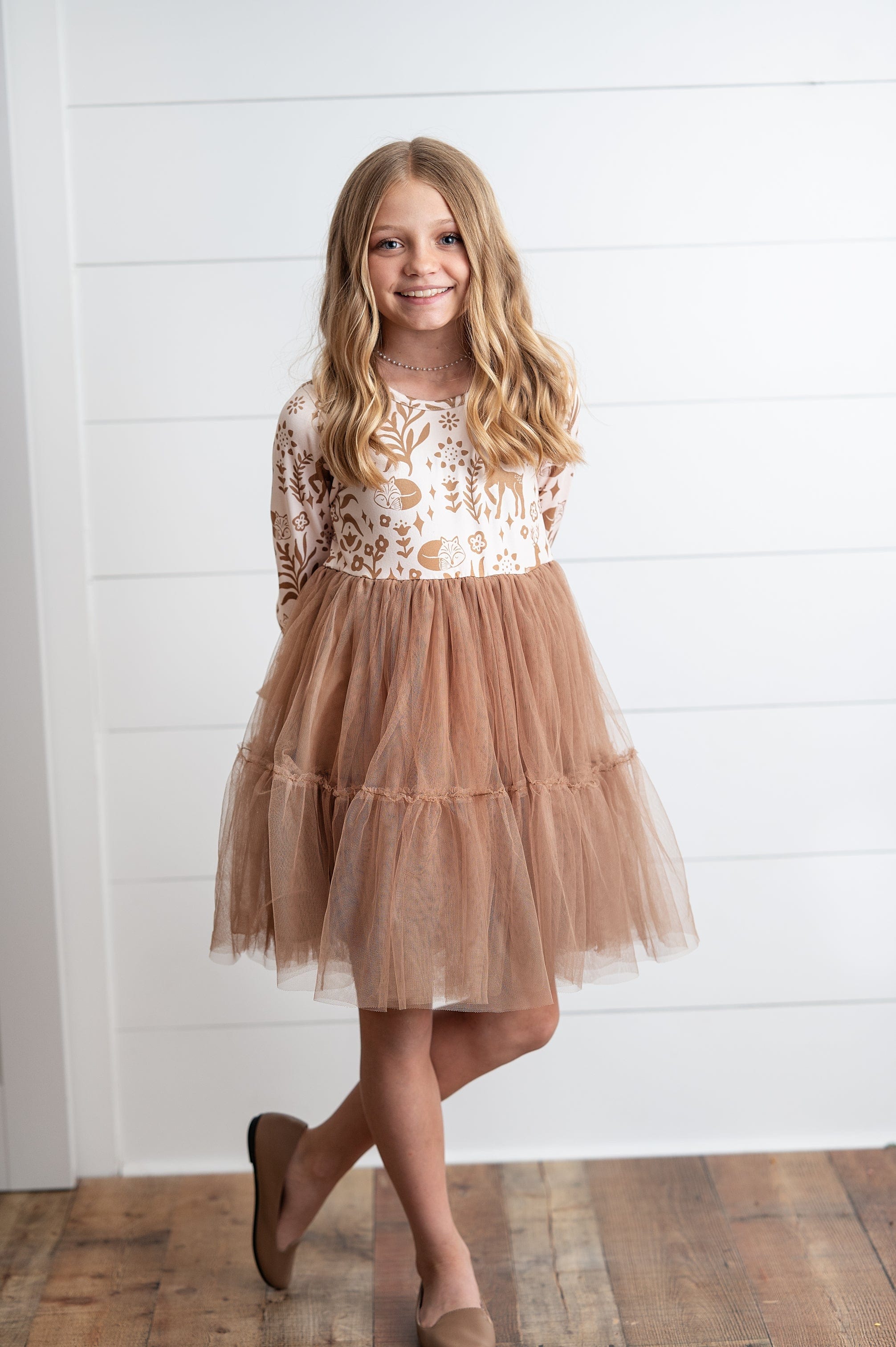 This Woodland Deer Tulle Dress brings a touch of magic to any little girl's wardrobe. Featuring a shimmering woodland forest animal motif and layers of soft, airy tulle, it’s perfect for twirling, playing, and making every day feel like a special occasion. Comfortable and charming, this dress adds a playful sparkle to birthdays, parties, or just because!